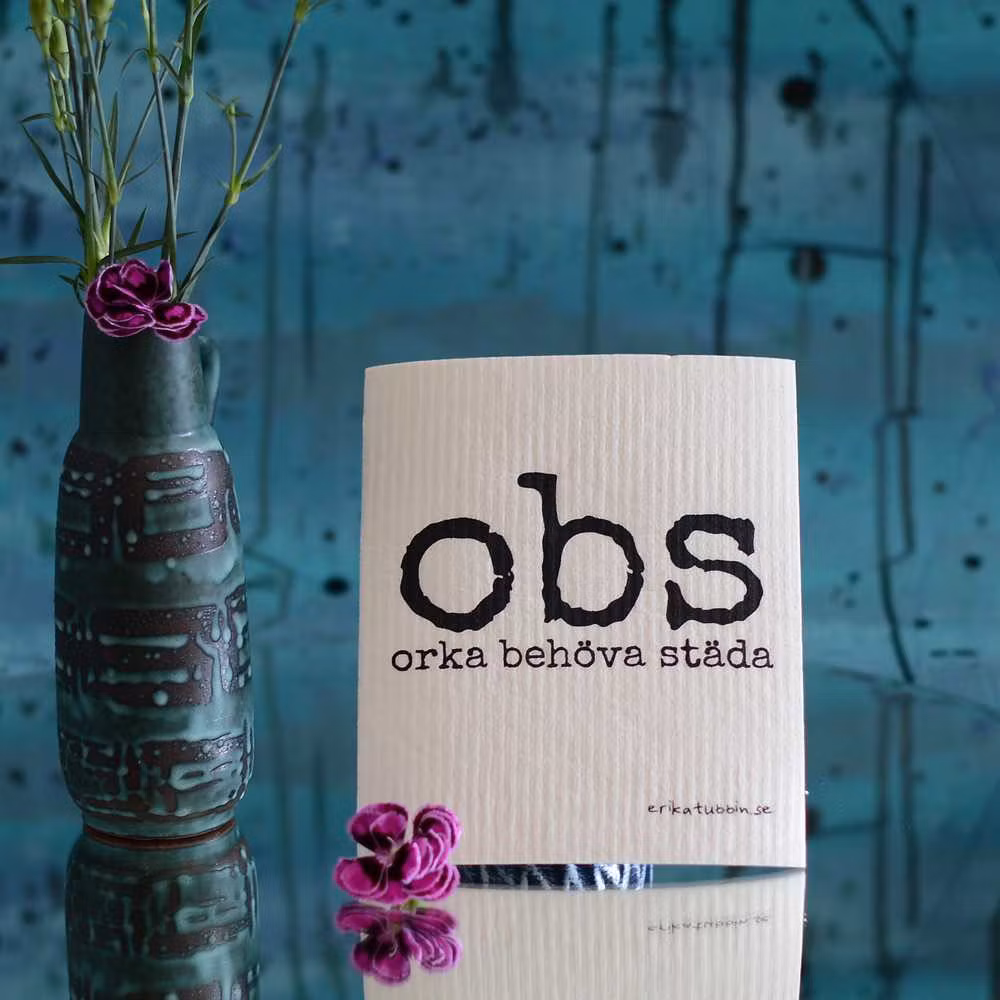 Disktrasa med text: "OBS orka behöva städa". Med en rolig disktrasa blir vardagssysslorna lite enklare att utföra. Disktrasan är vit med svart tryck. Tvättbar och tryckt med miljövänlig färg. Ge en humoristisk städtrasa i present till någon eller köp den till dig själv för att muntra upp tillvaron och köket.Mått: 18x20 cm.Material: Bomull- och cellulosafiber.Färg: Svart tryck på benvit trasa.