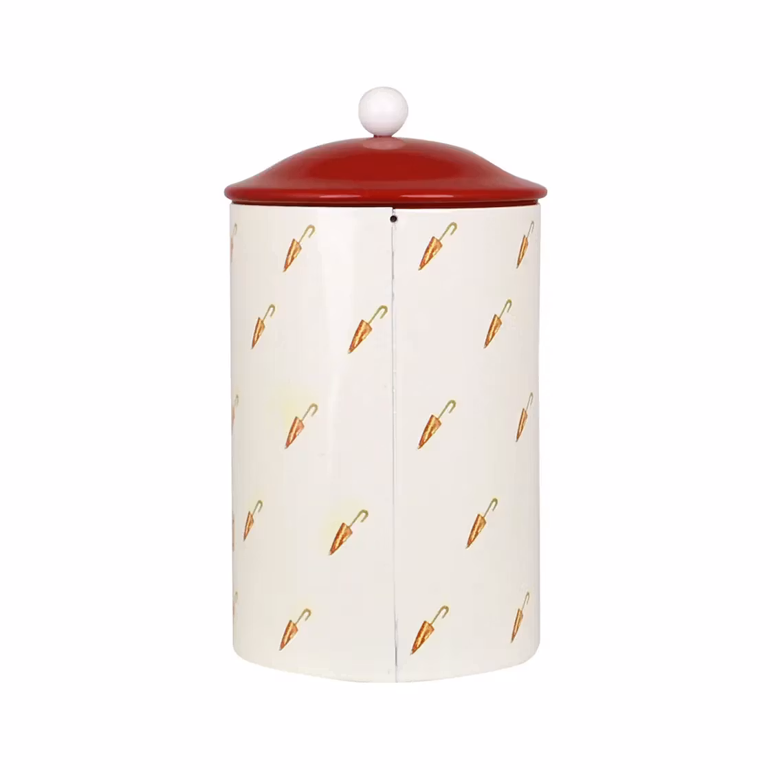 Plåtburk med nostalgiskt julmotiv för julgodis. Lock i rött med en rund knopp. Silikonring som gör att locket sitter stadigt och sluter tätt.