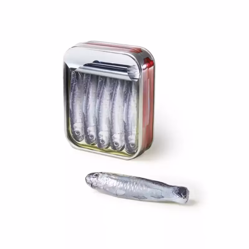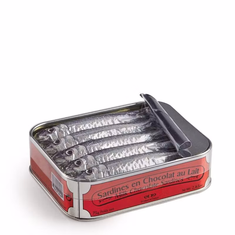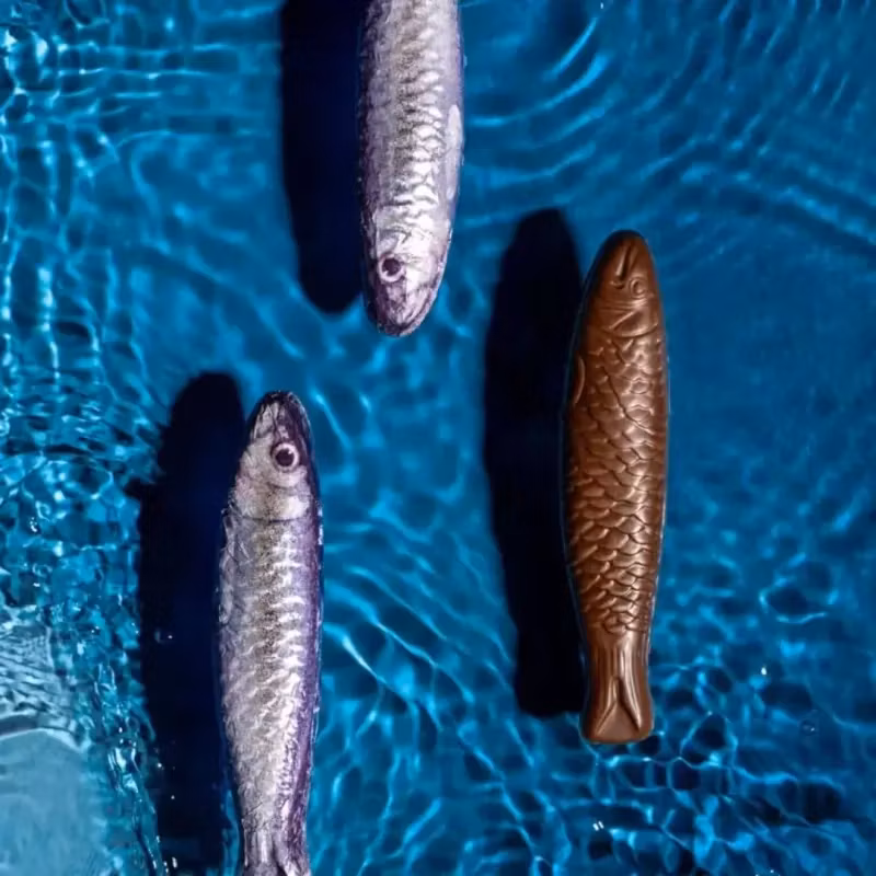 ligger de populära chokladsardinerna av finaste 39% mjölkchoklad insvepta i folie, idealiska som present eller litet tilltugg.