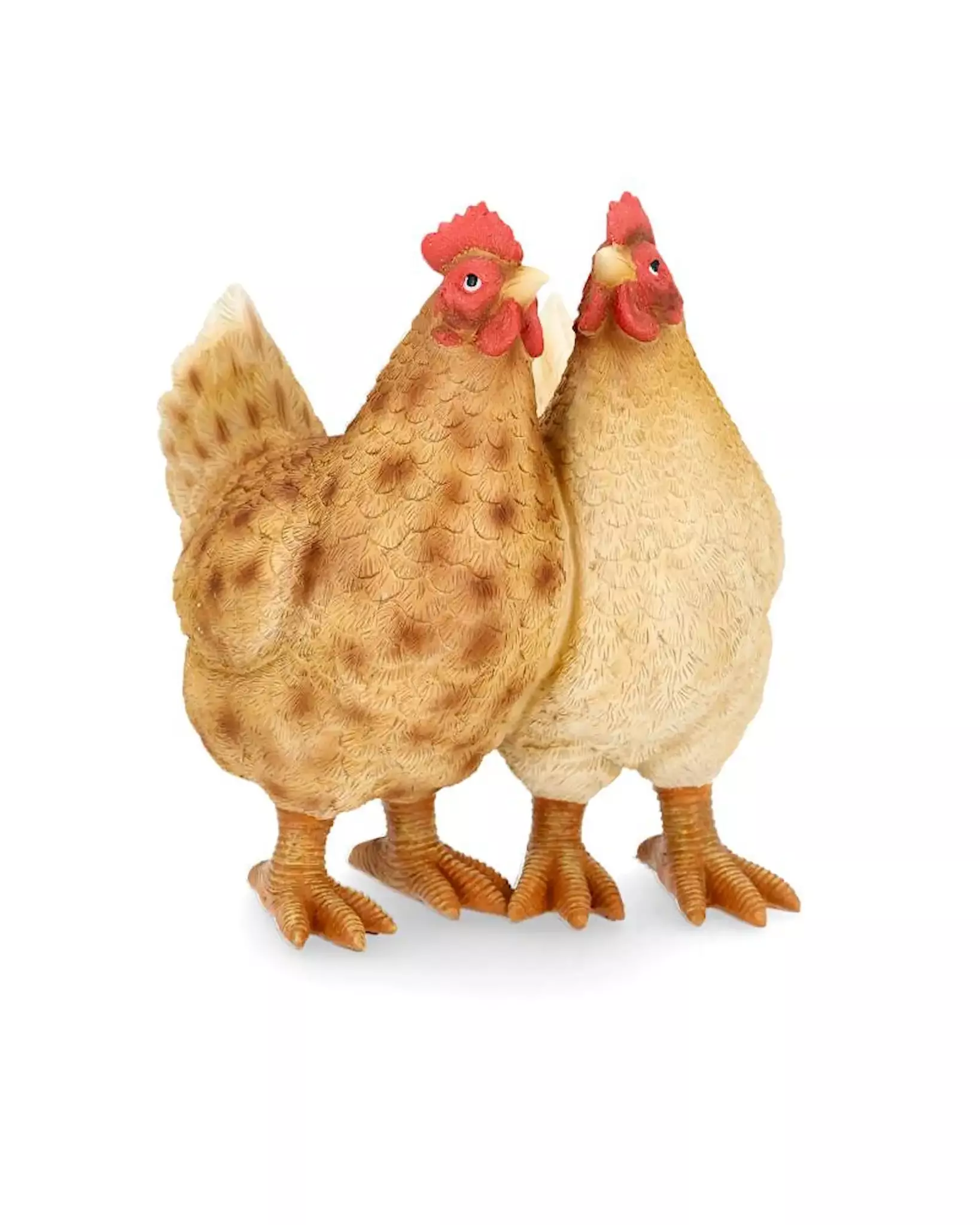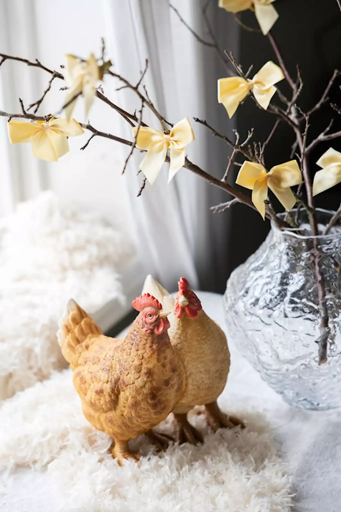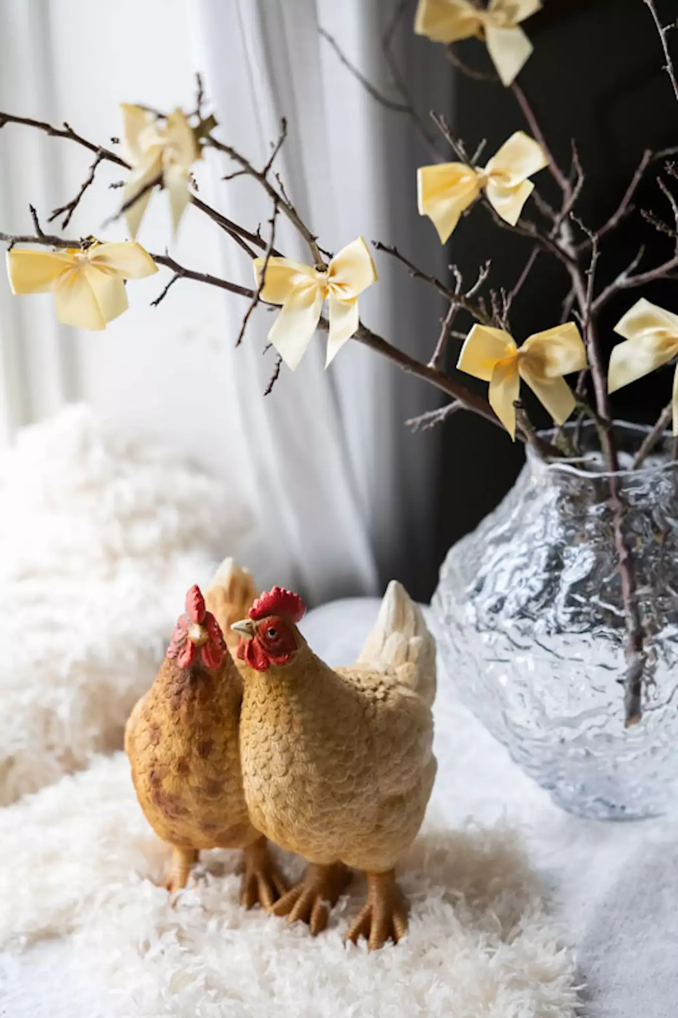 Denna dekoration med två hönor blir ett lekfullt inslag i inredningen. Perfekt till påsk. Tillverkad i poly.